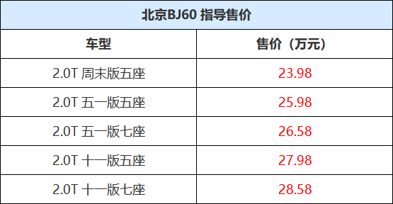 北京BJ60共计推出5款车型,其中五一版与十一版均提供五座与七座版本,差价均为6000元。除了第二排座椅前后调节外,五座与七座在配置上并没有明显差异。