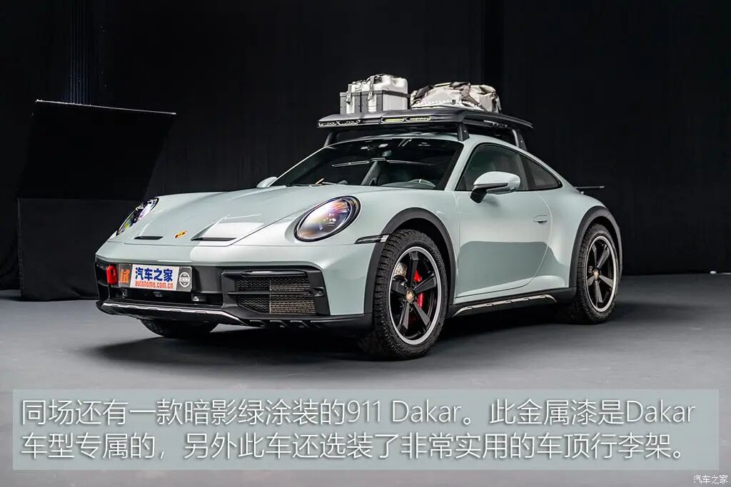 同场还有一款暗影绿涂装的911 Dakar,此金属漆是Dakar车型专属,此外该车还选装了非常实用的车顶行李架。