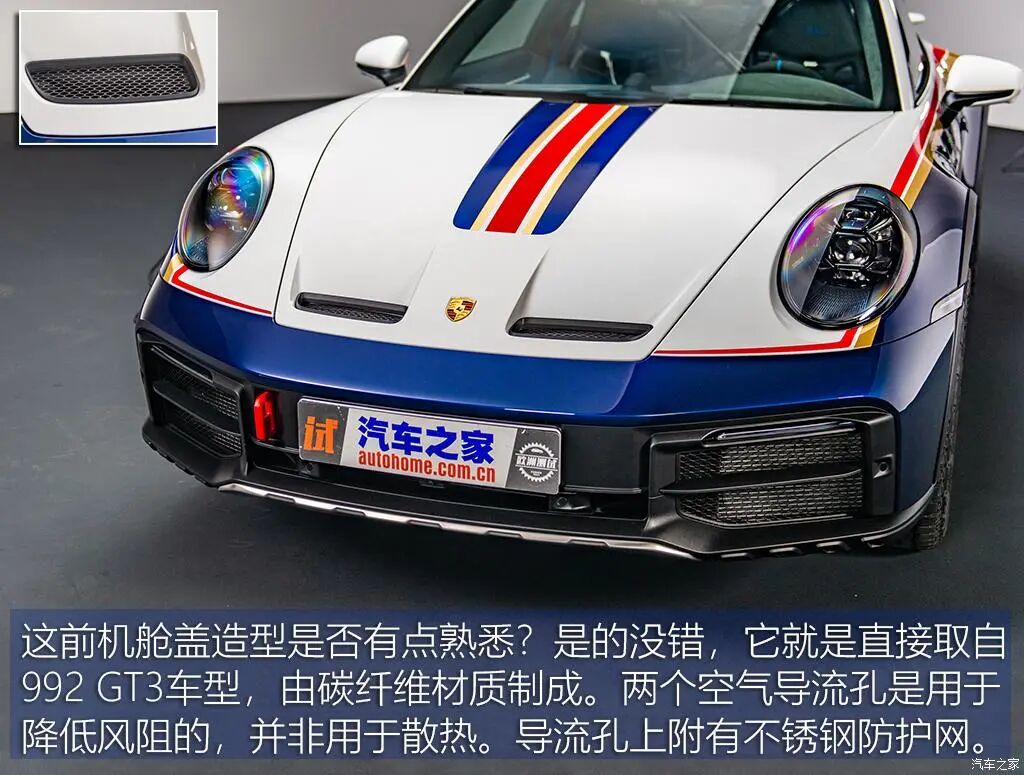 前机舱盖直接取自992 GT3车型,由碳纤维材质制成。两个空气导流孔是用于降低风阻的,并非用于散热。导流孔上附有不锈钢防护网。