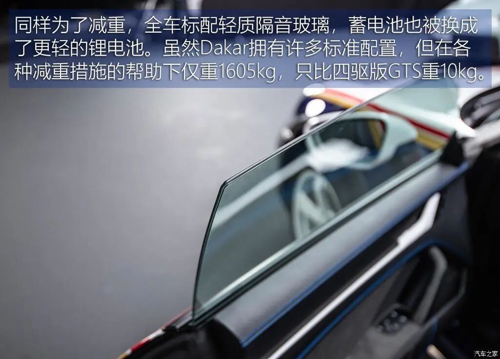 同样为了减重,保时捷911 Dakar标配轻质隔音玻璃,蓄电池也被换成锂电池。虽然911 Dakar有许多标准配置,但是在各种减重措施的帮助下仅重1605kg,只比四驱版GTS重10kg。