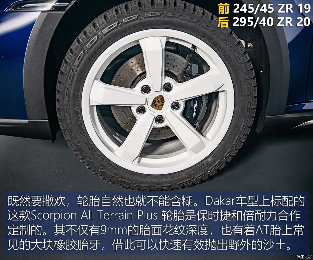 Dakar车型上标配的这款AT轮胎是保时捷和倍耐力合作定制的,其不仅有9毫米的胎面花纹深度,也有着AT胎上常见的大块橡胶胎牙,借此可以快速有效抛出野外的沙尘。