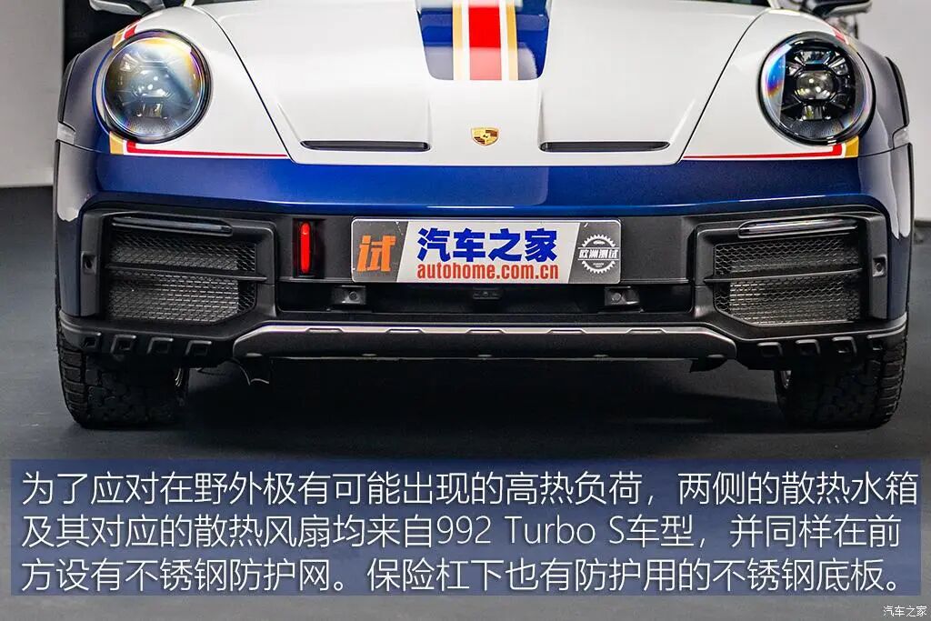 两侧的散热水箱及其风扇均来自992 Turbo S,同样在前方设有不锈钢防护网,保险杠下也有不锈钢护板。