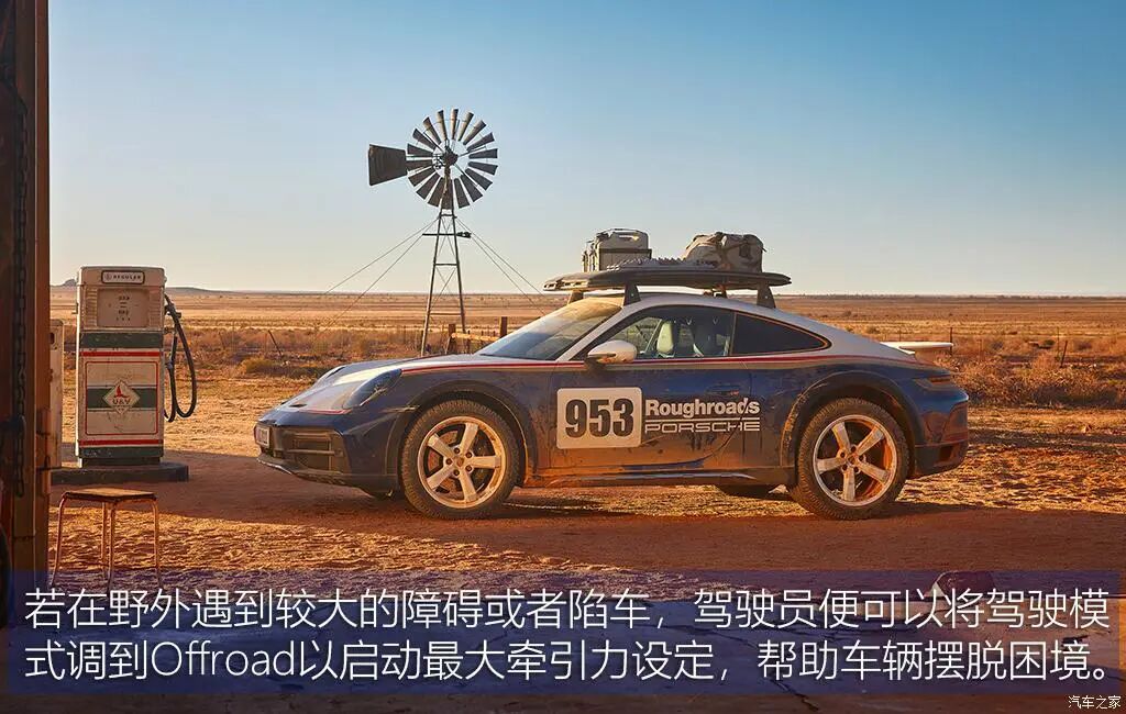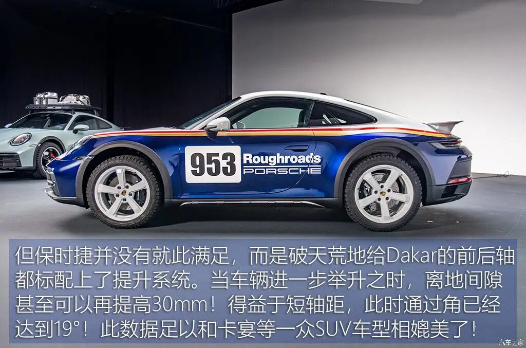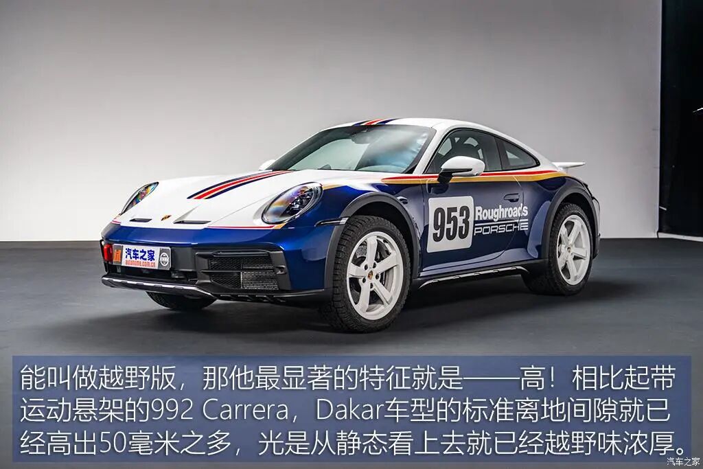 越野版911最显著的特点就是高!相比带运动悬架的992 Carrera,Dakar车型的标准离地间隙就已经高出50毫米之多,看上去越野味儿十足。