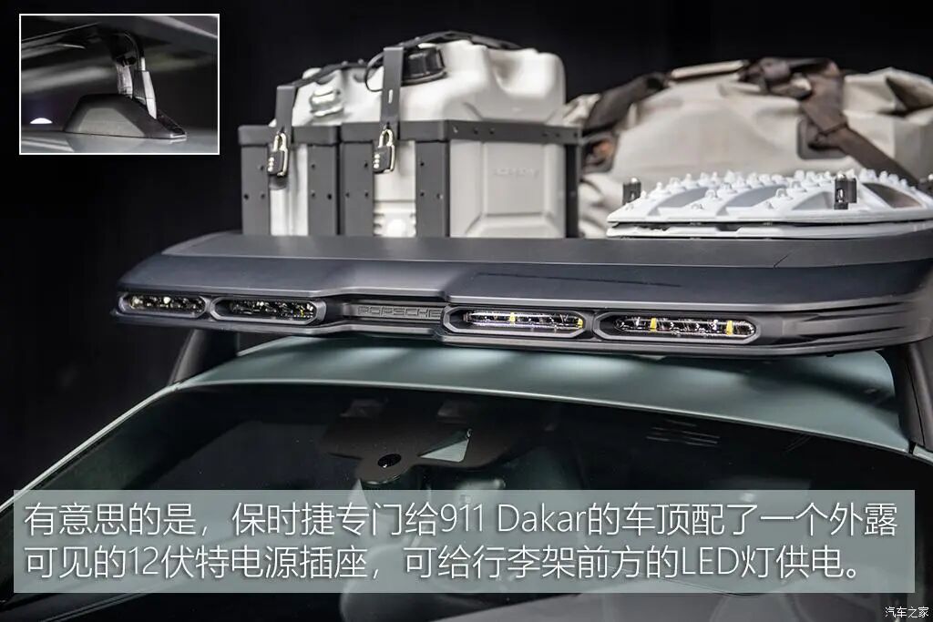 保时捷还专门给911 Dakar的车顶配了一个外露可见的12V电源插座,可给行李架前方的LED灯供电。