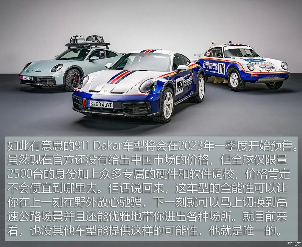 保时捷911 Dakar预计将会在2023年第一季度开始预售。虽然现在官方还没有给出中国市场的价格,但全球限量仅2500台的身份加上众多专属的硬件、软件调校,价格肯定不会便宜到哪去。但是话说回来,这款911的优点就在于全能性,你可以在野外放心驰骋,也可以切换到日常的高速公路场景,所以它有着独特的魅力,这是其他911车型无法替代的。