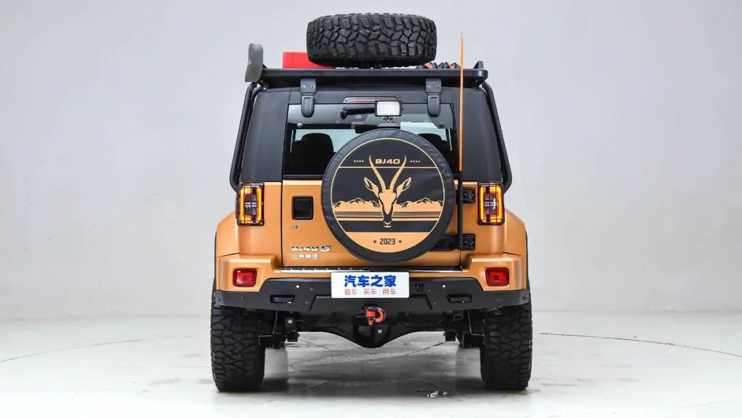 来到车尾,两台车都配备了“小书包”,其中BJ40提供了带可可西里藏羚羊标识的备胎罩,坦克300则选择让白色轮圈裸露在外,更强调复古调性与颜值。值得一提的是,BJ40将原厂油箱扩容至了120L,保证了车辆的续航能力。