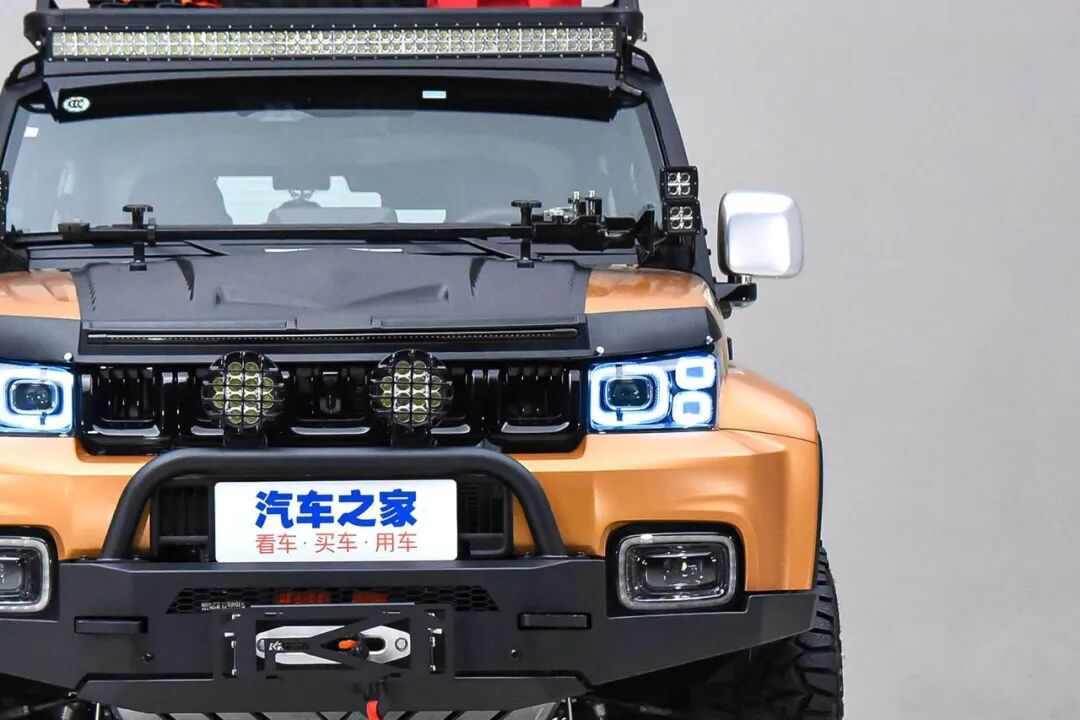 配置上,BJ40换装了前后竞技杠与侧杠,还加装了车身马踏和车顶铝合金行李架。并在车头增加了一组射灯,两侧A柱共加装了4盏射灯以及车顶的长条射灯。此外,12000磅的沃恩绞盘、猴爬杆、防沙板、拖车绳、拖车钩之类的辅助脱困装备也一应俱全。