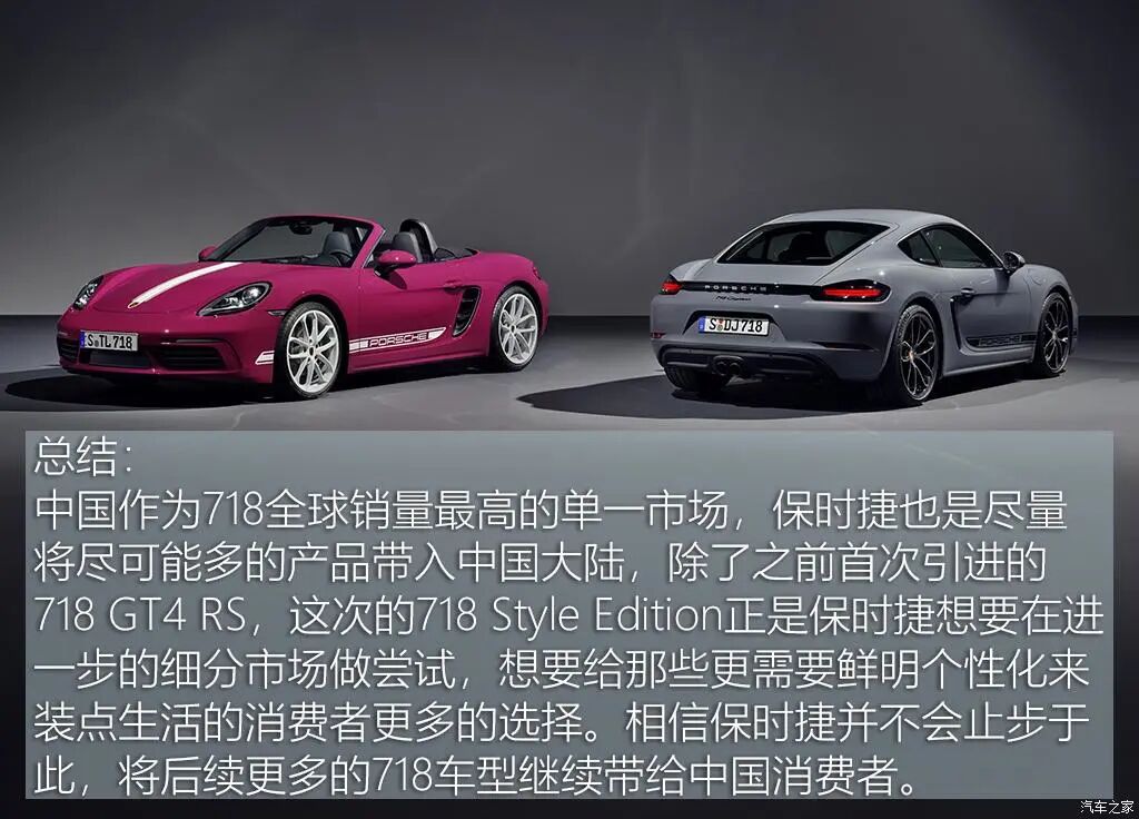 本次的保时捷718 Style Edition正是保时捷对于中国——这个718销量最高单一市场中的细分化单元所做的一次尝试。毕竟这个级别的用户总会需要更加独特的选择来装点自己的生活。就像之前引进的718 GT4 RS一样,保时捷在后期也会将更多的718车型带给中国消费者,让我们拭目以待。