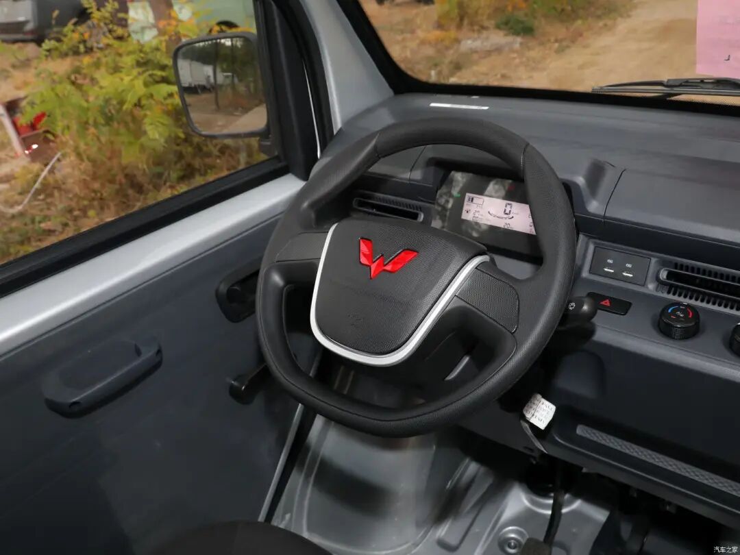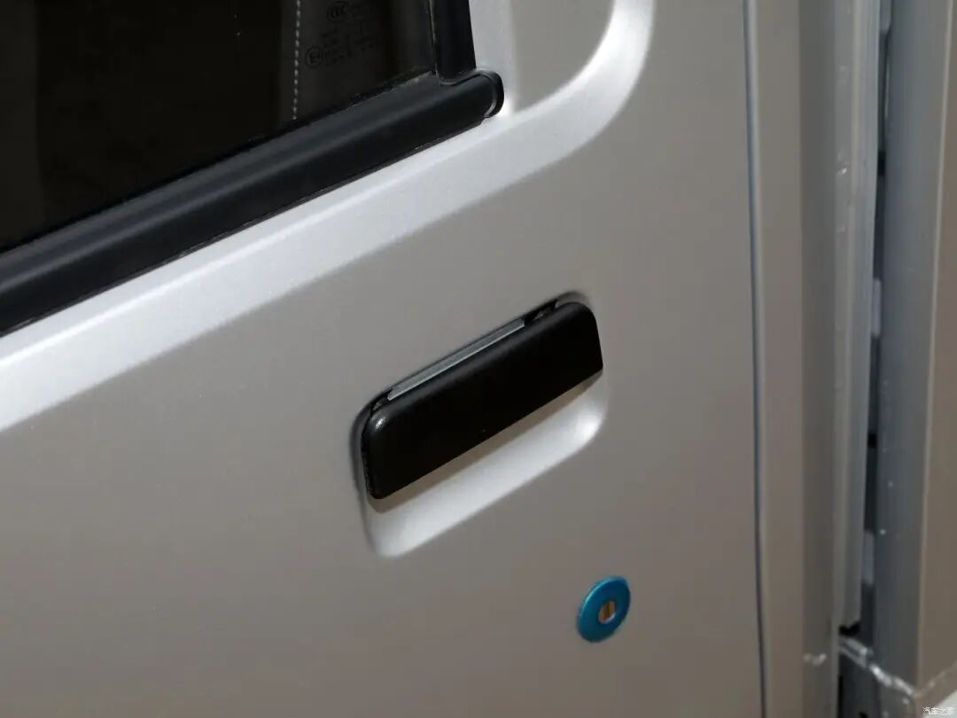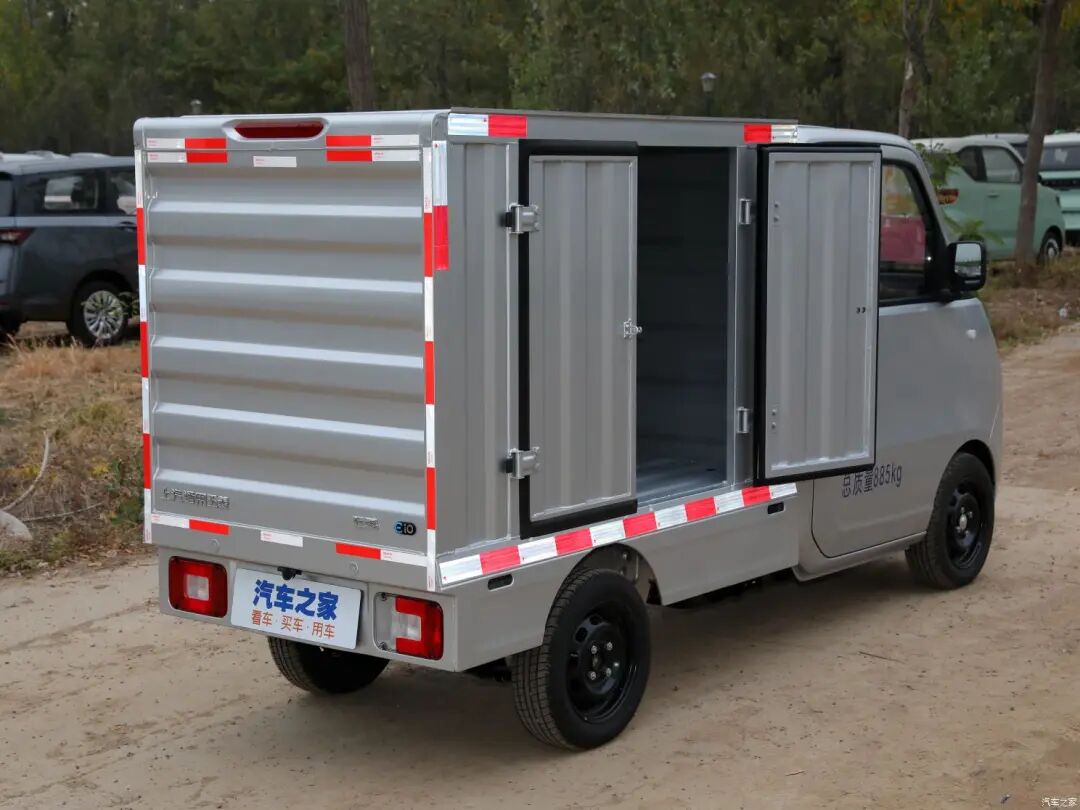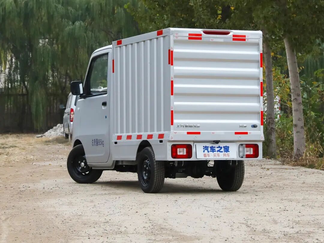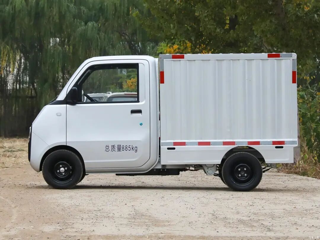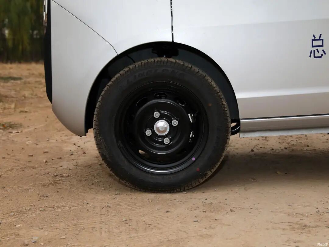 车身侧面,新车采用了单排座舱设计,车身后半部分为侧开门的封闭式货箱,配备了钢制的四孔式轮圈。新车尺寸长宽高分别为3310mm/1080mm/1690mm,货箱尺寸长宽高为1625mm/1000mm/1040mm,额定载货质量200公斤。