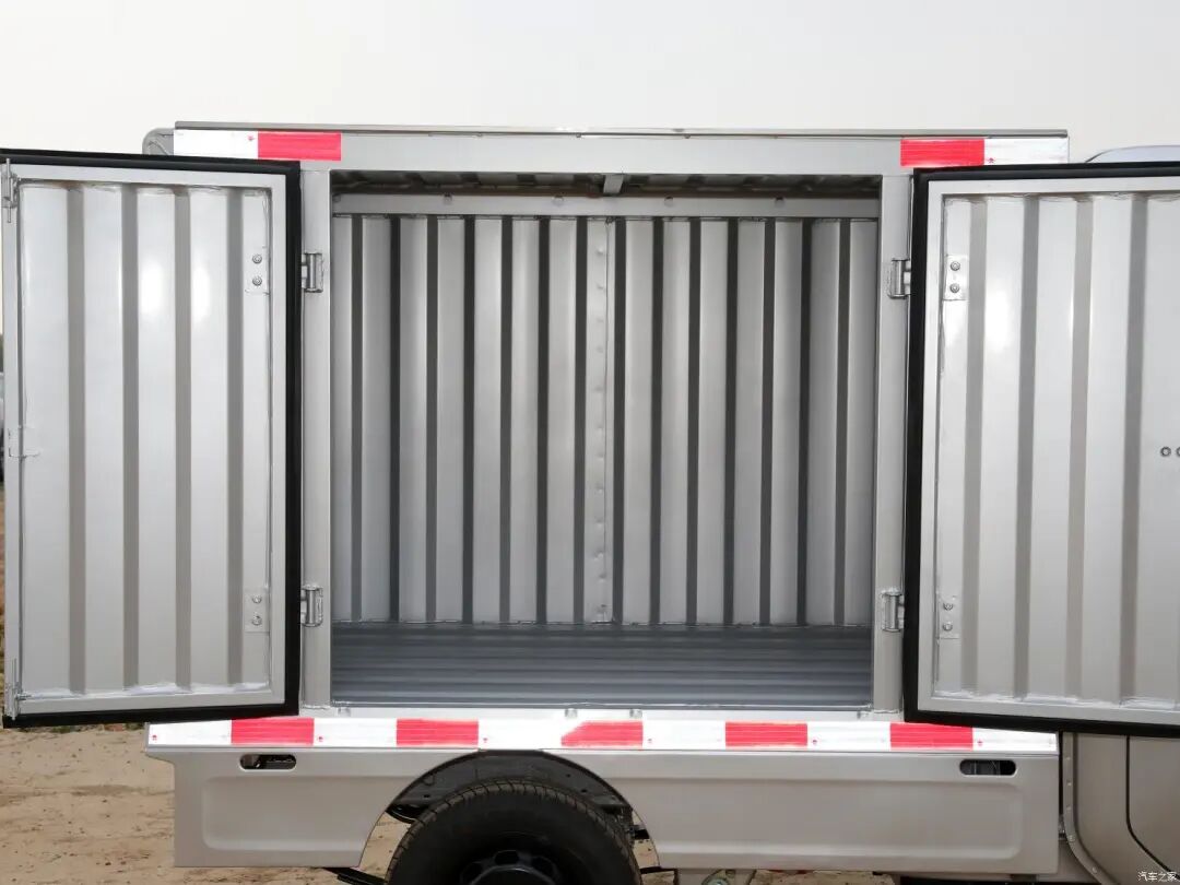 车尾部分,新车整个后货箱在边角处贴满了反光条,以提高辨识度。后尾灯采用了矩形设计,并使用了熏黑式的灯罩,像转向灯、倒车灯、雾灯等光源设备应有尽有。