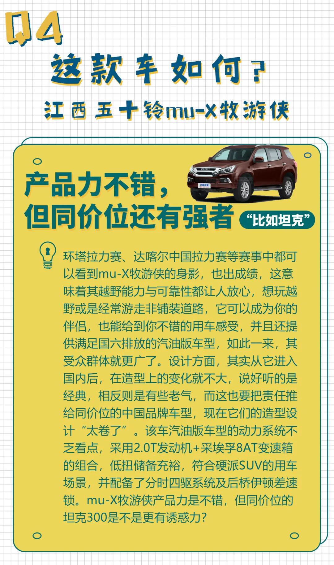 Q4,江西五十铃mu-X牧游侠怎么样?也算是老牌硬派SUV了,整体机械素质没得提,2.0T、采埃孚8AT、分时四驱、后桥伊顿差速锁……关键用不了20万就能买,是挺香,但是想精致点的话,它怕是不太行。