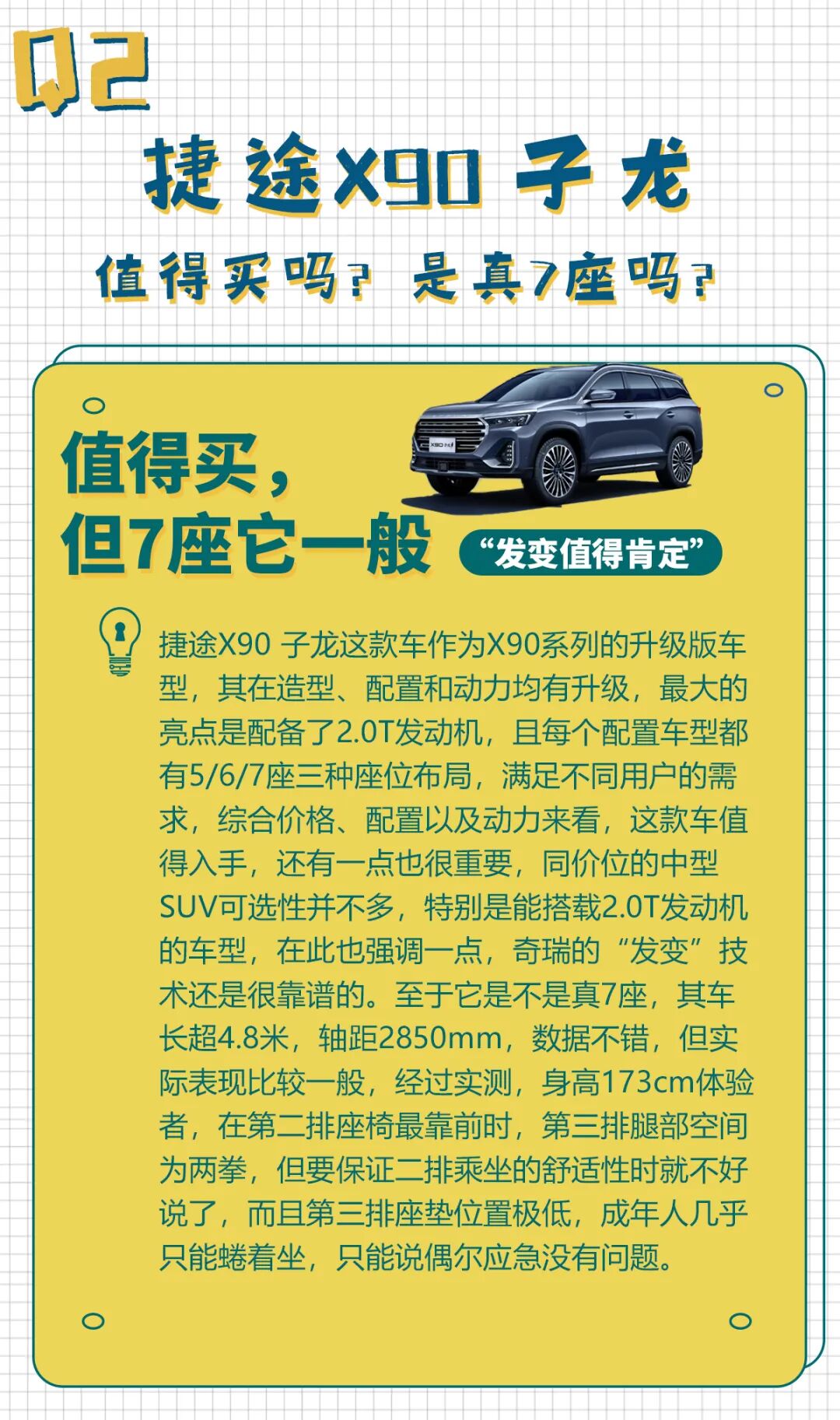 Q2,捷途X90 子龙值得买吗?是真7座吗?车的产品力不错,同价位下值得入手,但7座可不太正经,仅能应急使用。
