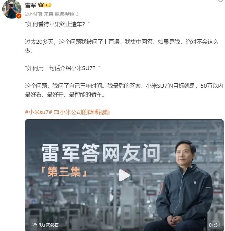 时间回到三天前,雷军在个人微博发文回复“如何用一句话介绍小米SU7”,字里行间充满着自信和谦逊,“小米SU7”的目标就是,50万以内最好看、最好开、最智能的轿车。”三个“最”无疑是自信的最佳佐证,之所以说其谦逊,原因在于50万内,相比其他车企高管几百万以内的说辞,雷军已经低调很多了……在三个之最中,我们也收集到用户最为关心的点是性能与智能化。