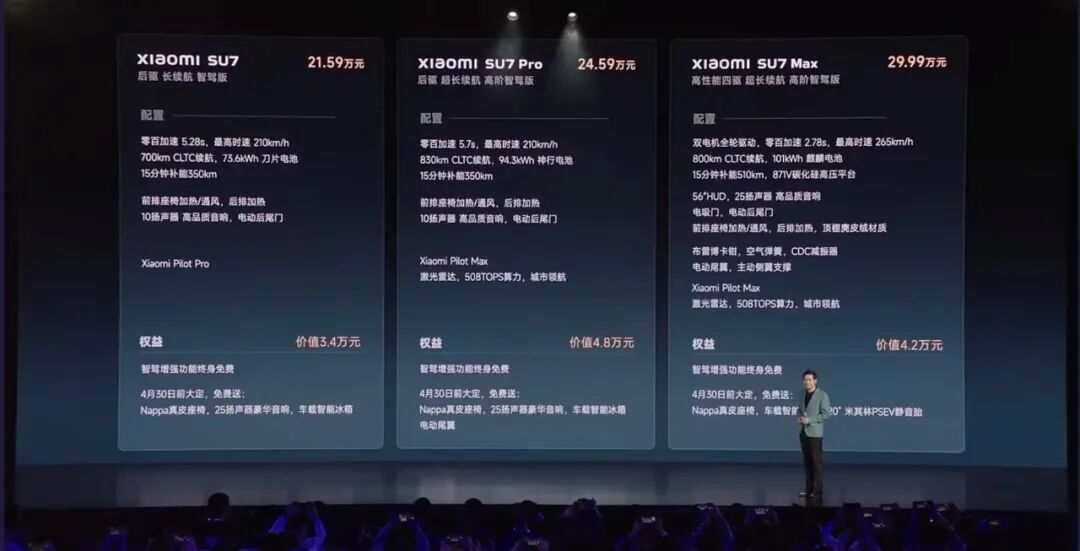在一次次“雷式营销”后,车圈话题王小米SU7终于上市了,先说各位最为关心的价格,全系共3款车型,售价区间21.59-29.99万元。米粉悬着的心终于放下来了。那么持币观望的看官你们的等待值得吗?最终会精神上的支持还是付诸实际行动……请把答案留在评论区。