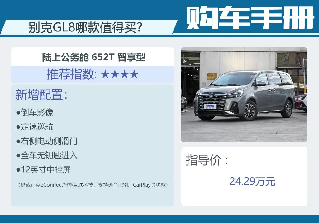 智享型的售价上涨了一万元,但新增了倒车影像、定速巡航、12英寸中控屏(搭载别克eConnect智能互联科技,支持语音识别、CarPlay等功能)、右侧电动侧滑门、全车无钥匙进入等多项配置,买它还是比较划算的,适合预算偏低且对舒适性配置要求不高的消费者。
