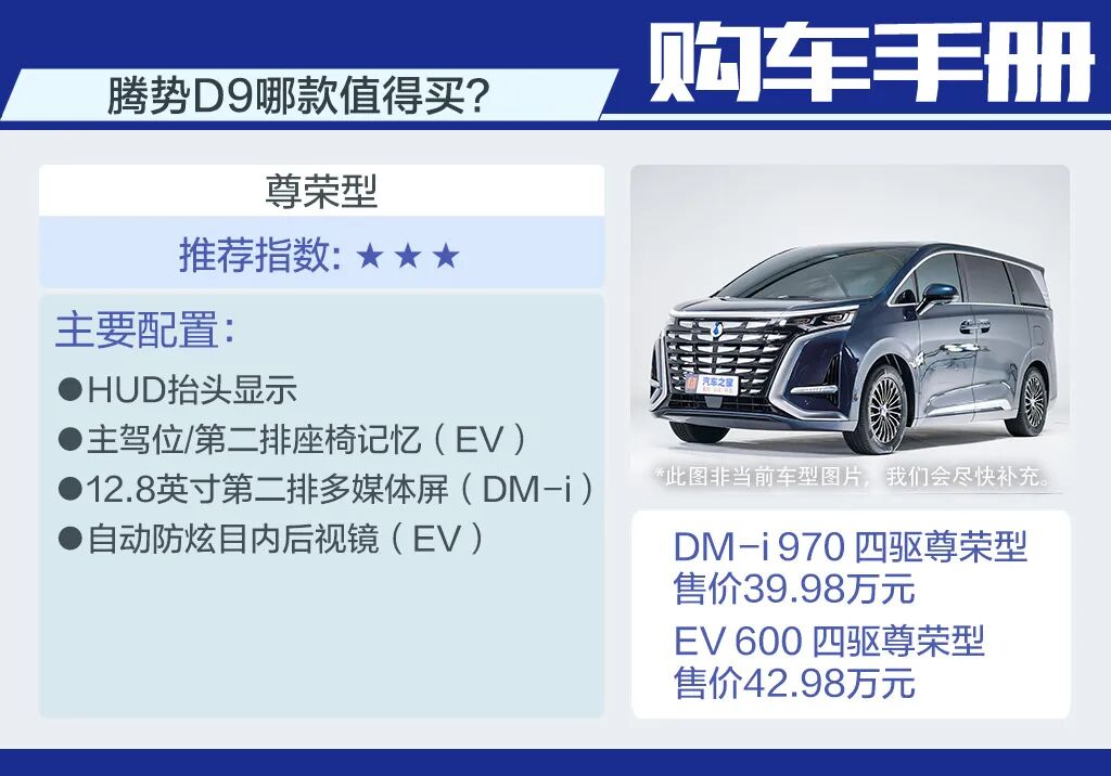 作为腾势品牌“2.0时代”的全新产品——腾势D9预售开启2个月,订单便超过3万台。新车定位中大型MPV,推出DM-i混动版与EV纯电动版共计7款车型,售价32.98-45.98万元。作为比亚迪技术背书的高端新能源MPV,听着很心动?一起来看看哪款配置最值得选择吧。