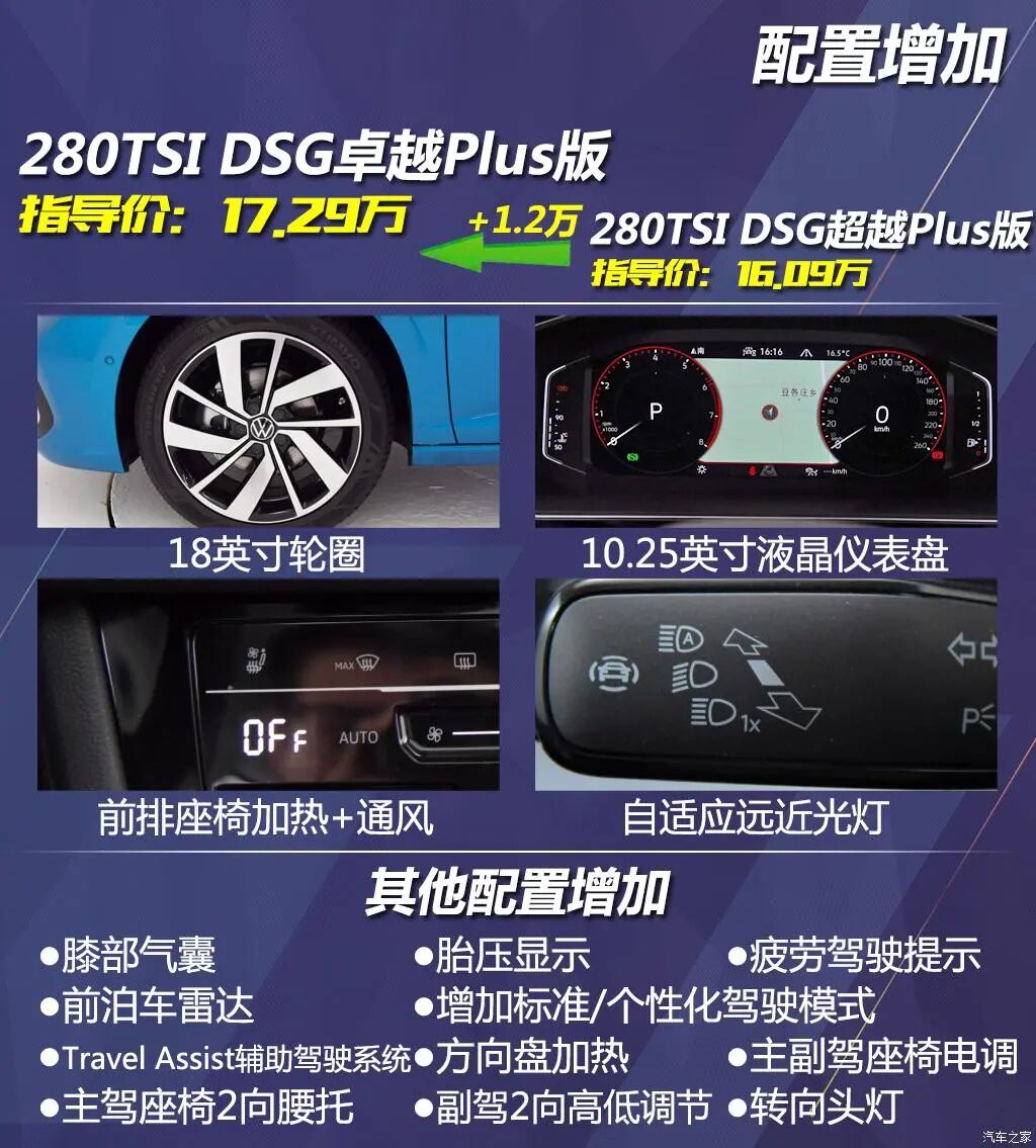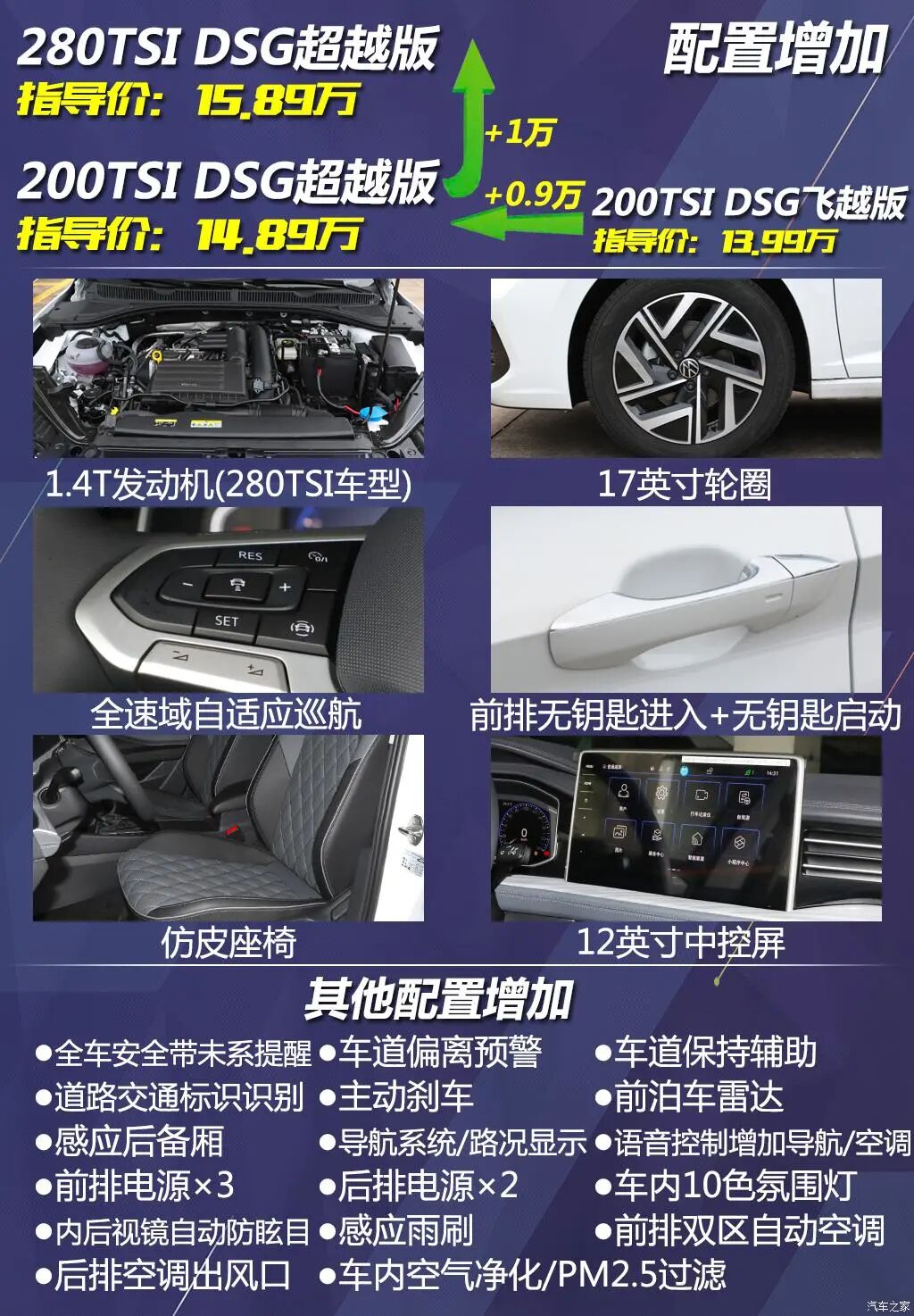 从飞越版增加0.9万元,就可以来到超越版,配置增加可以说是非常多了,比较重要的有17英寸轮圈、无钥匙进入+一键启动、全速域自适应巡航+车道保持、12英寸屏幕、仿皮座椅等,感觉就是进入了不同的时代,不过至此你拥有的仍是1.2T车型,所以我真的推荐你再多花1万元升级到1.4T版本,其他配置还能得以保留,动力体验能有很大提升。所以配置和动力表现均衡的280TSI DSG超越版,全系最值得推荐。