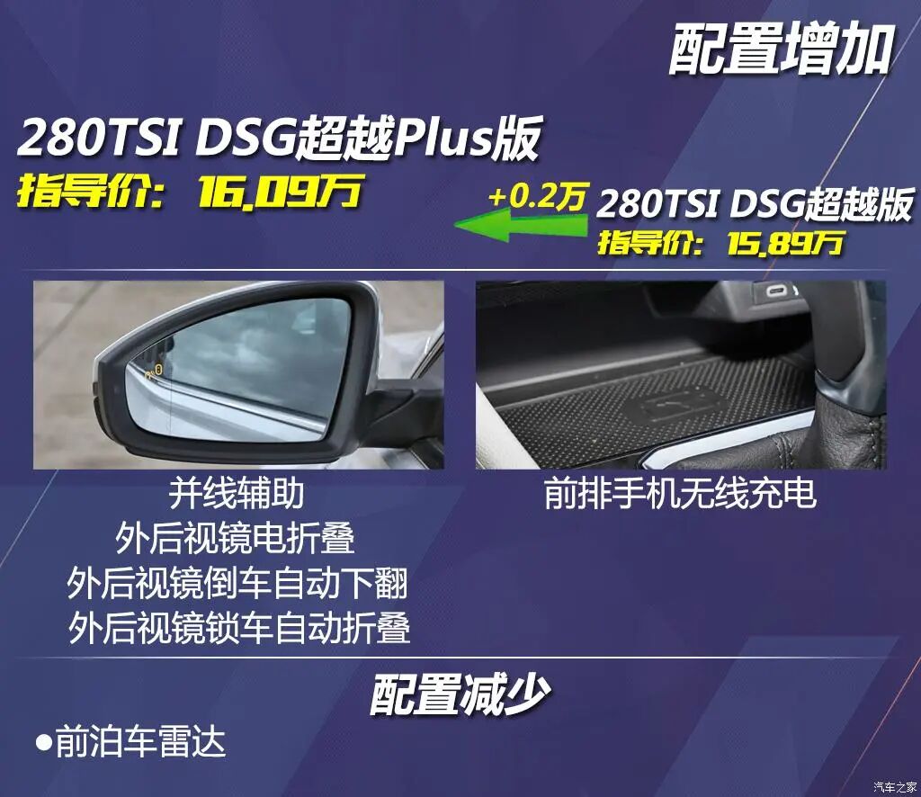 再增加0.2万元,来到了280TSI DSG超越Plus版,配置倒是也相应增加,便利性会有提升,但相比较刚才的超越版而言,没那么有诱惑力;最重要的是它还减少了前泊车雷达这个配置,让人感觉匪夷所思。