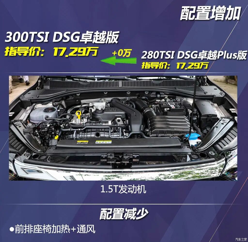 作为全系唯一的1.5T车型,300TSI DSG卓越版的价格和280TSI DSG卓越Plus版完全一致,动力上去了,价格不变,那配置肯定会有所缩水,没错,就是省略了前排座椅通风和加热。相比较而言,我认为1.4T的动力参数没比1.5T低很多,并且1.4T这套动力总成的保有量非常大,也久经考验,所以相同的价格还是选择更实用的配置吧,您说呢?