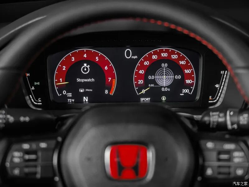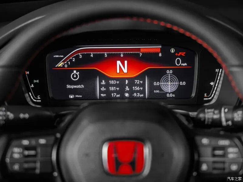 全液晶仪表融入红色背景,再加上G值显示,运动感还是不错的。如果你认为双表盘样式太常规,还可以切换更运动的主题,转速表占据视觉中心,机油压力、涡轮压力等信息都给显示,看到这样的仪表难免心生躁动。