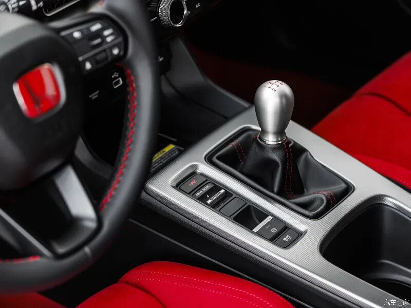 全新思域Type R中控台造型基本和普通版一致,不过Alcantara材质方向盘、红色缝线、红色内饰氛围灯、红色运动座椅以及金属质感的换挡杆都在诉说着这是一款性能车。
