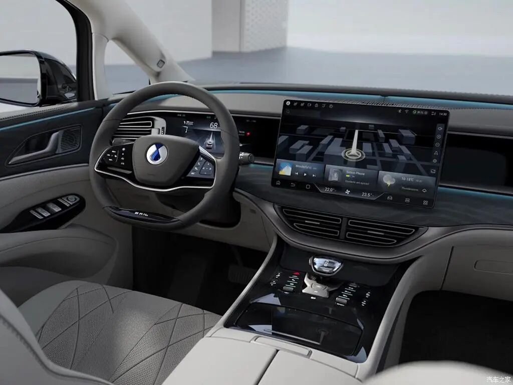 双辐式方向盘造型很眼熟吧?酷似比亚迪汉。在按键部分采用的是轻触式虚拟按钮设计,科技感再次拔高。材质上为真皮包覆,全系统一,手感出色。而大家喜闻乐见的方向盘加热功能,为顶配车型专属。