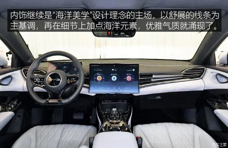 海豹内饰强调类似海洋生物般的优雅弧线,仪表台设计灵感来自于涌起的海浪,搭配全新造型的方向盘,十分符合其海洋的设计主题。细节方面,新车在中央通道区域采用类似“小蛮腰”的设计,上面的水晶挡把十分抢眼,搭配环抱式按键布局,为整体的内饰豪华氛围起到了点睛之笔的作用。