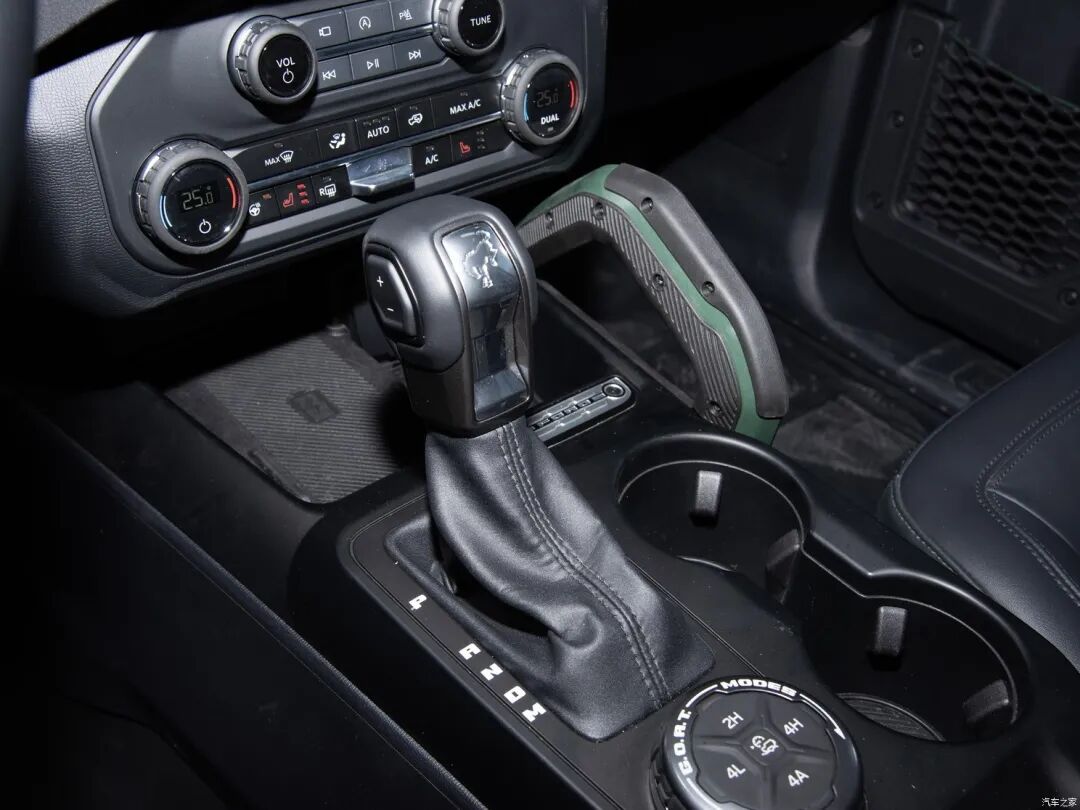 中控台下方仍然保留的多媒体系统和空调系统的物理按键,这对于一台深度越野车来说非常必要,尤其是在敞篷环境下,恶劣的环境中可能物理按键会操作更便捷。同时车内的按键也可以保证有雨水侵入时不被损坏。变速器排挡的后方,可以手动切换两驱、四驱低速等模式。由于车门可拆卸,车窗的按键和后视镜的调节,也位于车辆中央扶手箱位置。