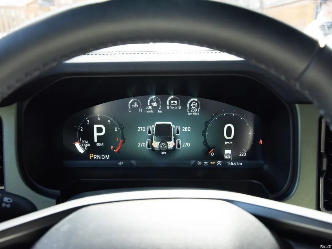 此外,中控台上方融入了软包材质,集成了前防倾杆断开、前差速锁、后差速锁、越野转弯辅助、越野蠕行模式等功能。新车还支持无人机联动,在极限环境下,中控屏直接显示无人机视角观测前路。