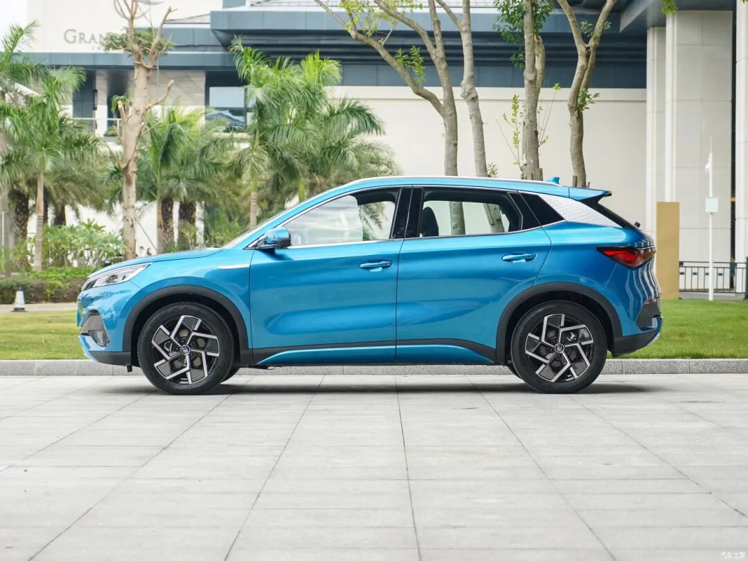 车侧比例协调,车身腰线从前翼子板处一直延伸至车尾,提升了层次感。车顶线条采用溜背设计,车身姿态更显低趴。车身尺寸方面,元PLUS定位于紧凑型SUV,长宽高分别为4455/1875/1615mm,轴距为2720mm。