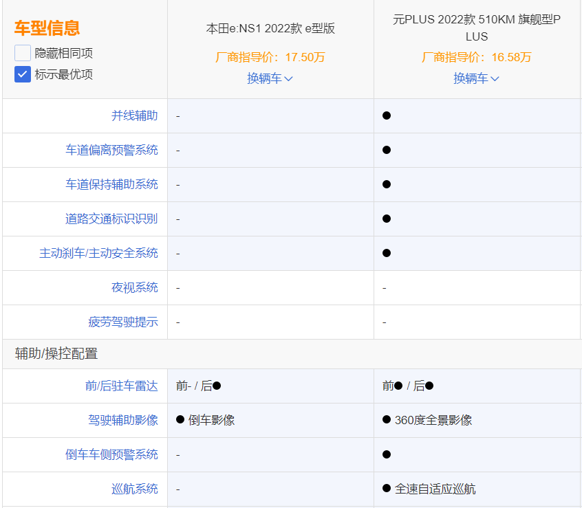 所选的两款车型具体配置是售价为16.58万元的元PLUS 2022款 510KM 旗舰型PLUS,和售价为17.5万元的本田e:NS1 2022款 e型版。在纯电动小型SUV细分市场,本田e:NS1的这个价格明显是偏高的,入门版甚至比定位于紧凑型SUV的比亚迪元PLUS顶配版都要高。