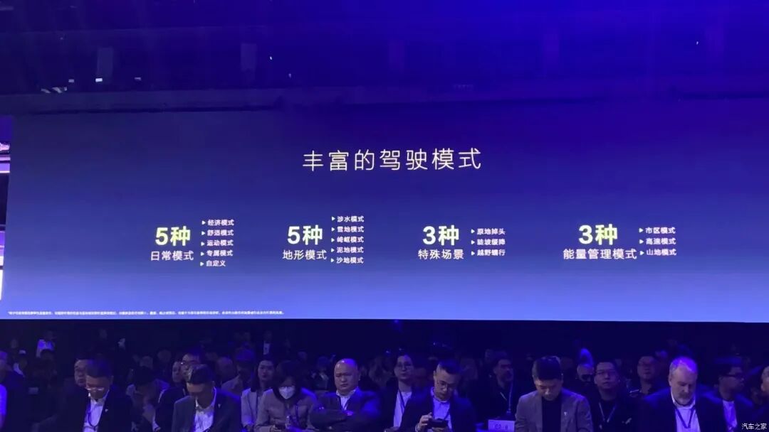 新车拥驾驶模式包含经济、舒适、运动、专属、自定义5种日常模式,涉水、雪地、崎岖、泥地、沙地5种地形模式,以及原地掉头、陡坡缓降、越野蠕行3种特殊场景,最小转弯半径3.2米。