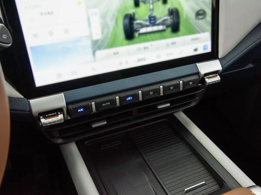 空调系统保留了大块的实体按键,更方便操作,下方还有50W无线快充。电子挡杆造型形似舰船操纵杆,设计感和品质感都在线。后方还有后差速器锁止控制键。