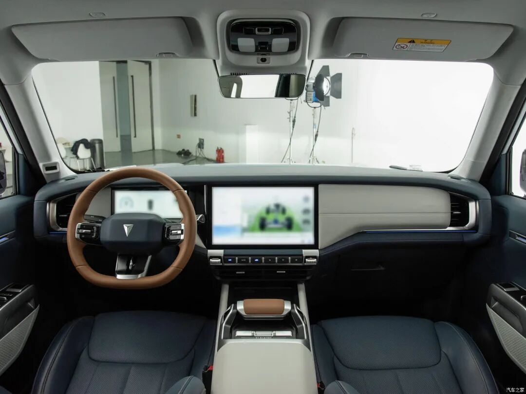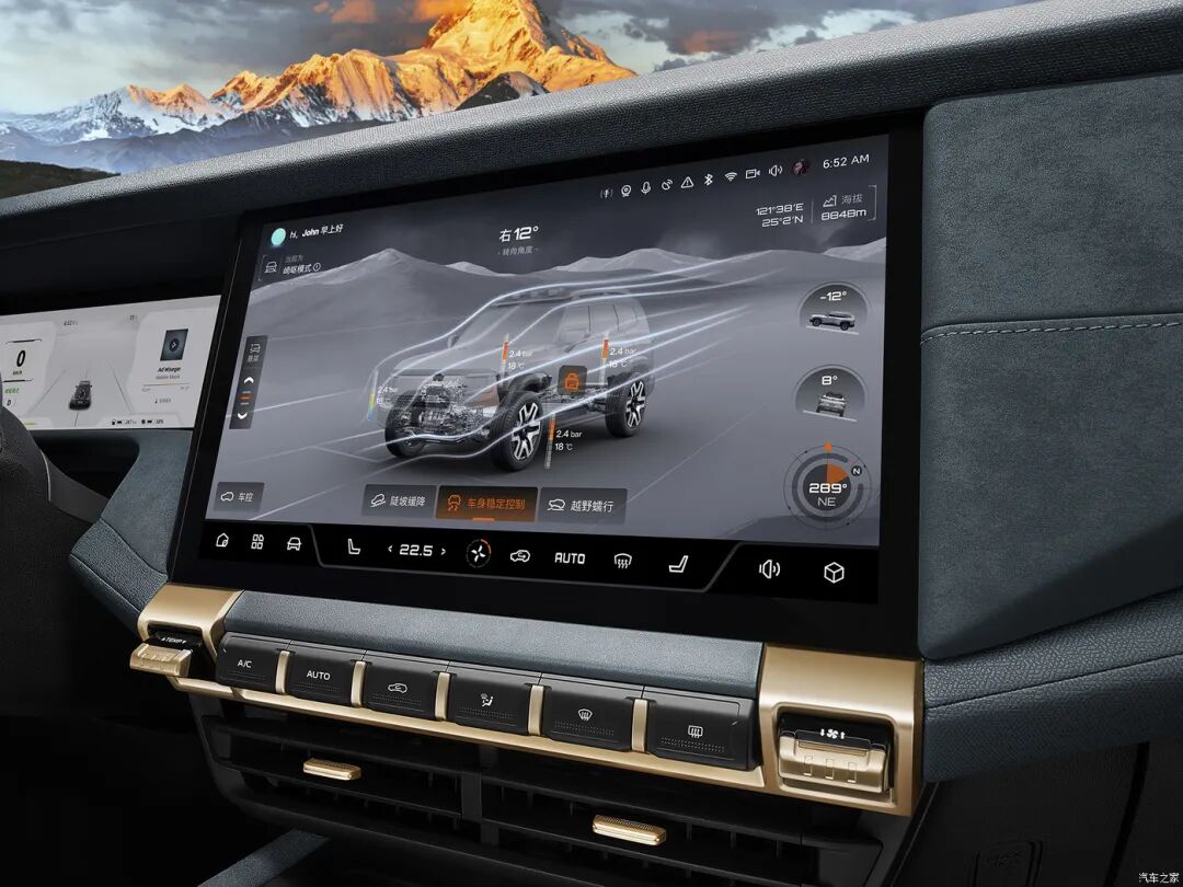 14.6英寸中控大屏集成了车辆设置、全景影像、车联网、语音助手、车辆信息显示等功能。空气悬架高度、轮胎压力/温度、方位信息、海拔、转向角度、俯仰角、侧倾角等都可显示。