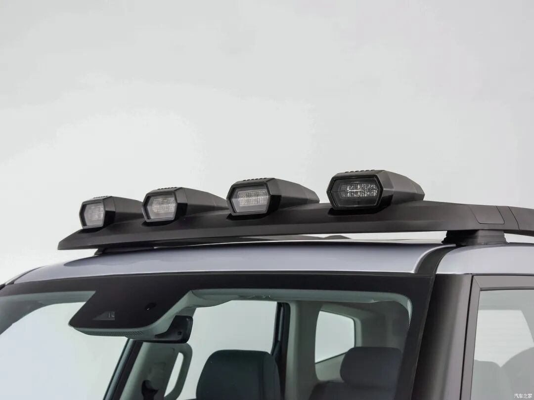 车顶行李架非常粗壮而且前方还带有射灯,其照射面积可以达到250平方米,行李架在行驶时可以承载80公斤重量。