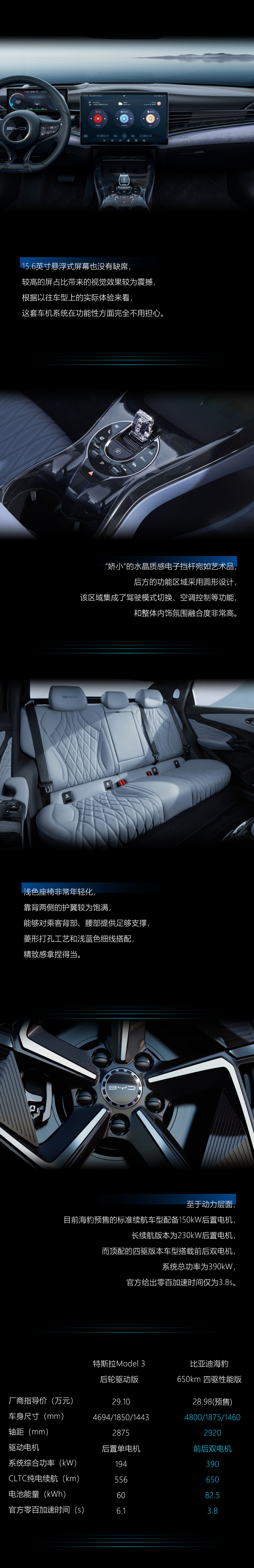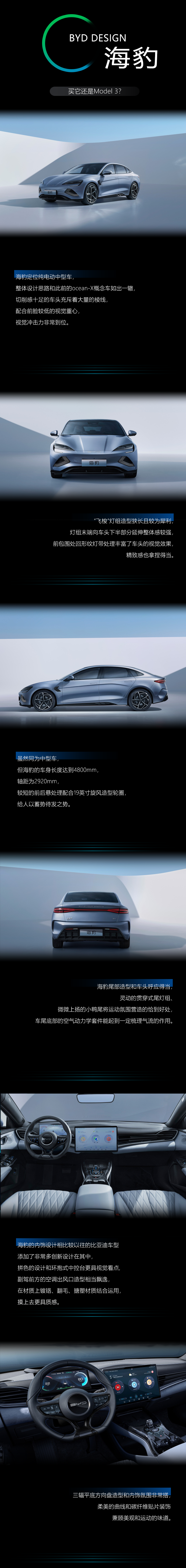 除了动力和尺寸外,相信在静态表现上海豹灵动、立体的设计也更能符合消费者的审美,用料丰富、更具质感的内饰细节要比Model 3上的极简风格更能吸引人,由此看来比亚迪海豹的确可以称之为Model 3的强劲对手,至于新车表现如何,我们拭目以待吧。