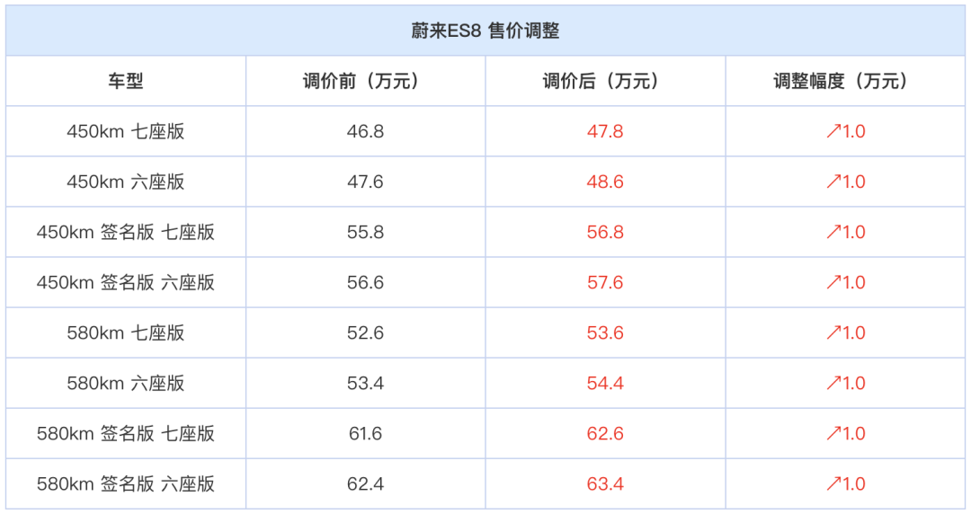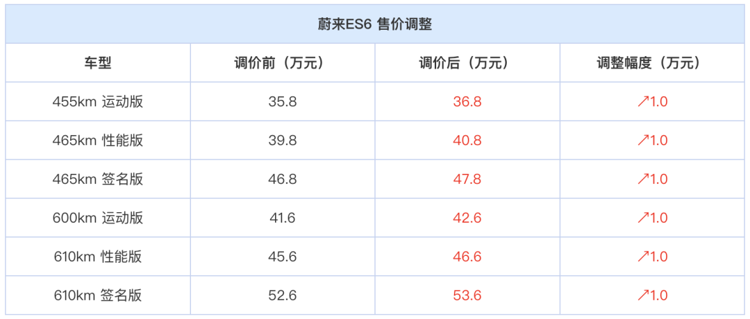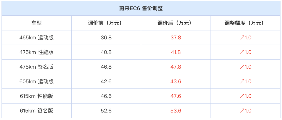 品牌/车型:蔚来ES6/ES8/EC6调价幅度:10000元生效日期:5月10日