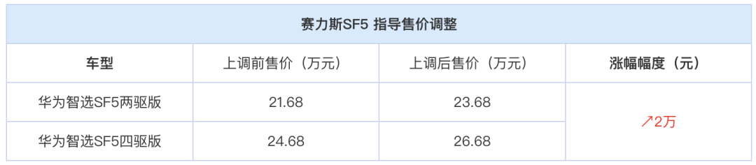 品牌/车型:赛力斯SF5调价幅度:20000元生效日期:5月6日