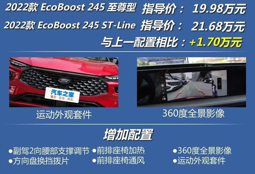 蒙迪欧 2022款 EcoBoost 245 ST-Line相比2022款 EcoBoost 245 至尊型增加了前排座椅通风、副驾2向腰部支撑调节、360度全景影像、方向盘换挡拨片以及前排座椅加热等配置。