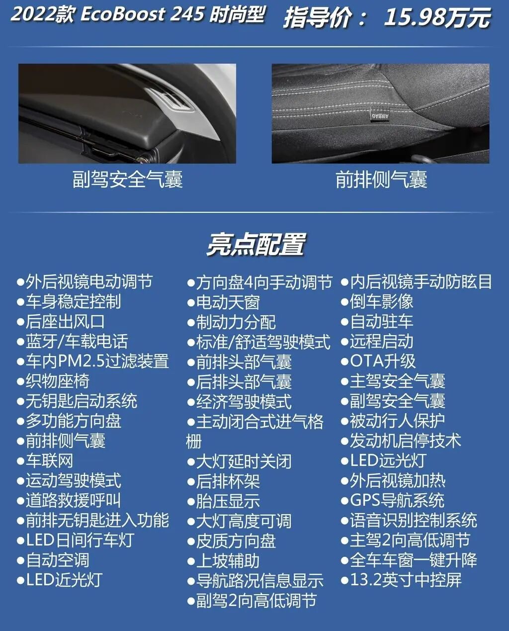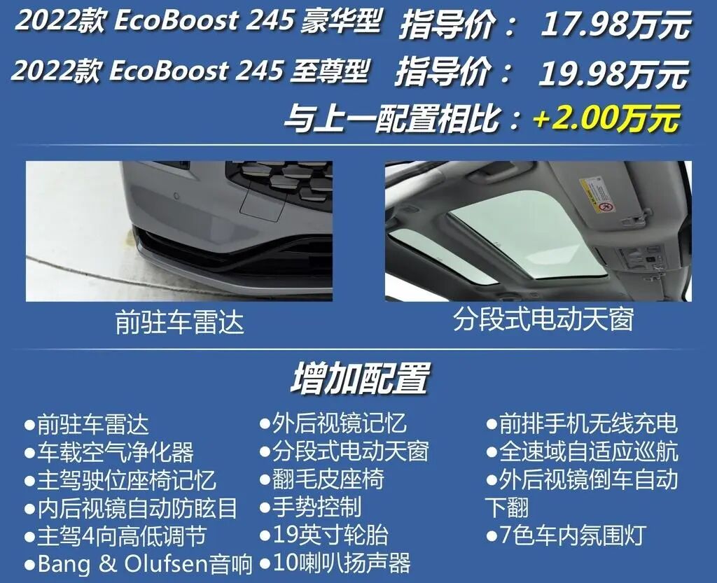 首先要推荐2022款 EcoBoost 245 至尊型,作为全系的次顶配车型它的配置十分丰富,像增加的全速域自适应巡航和B&O音响,能给你的日常用车体验带来极大的提升。