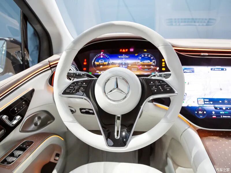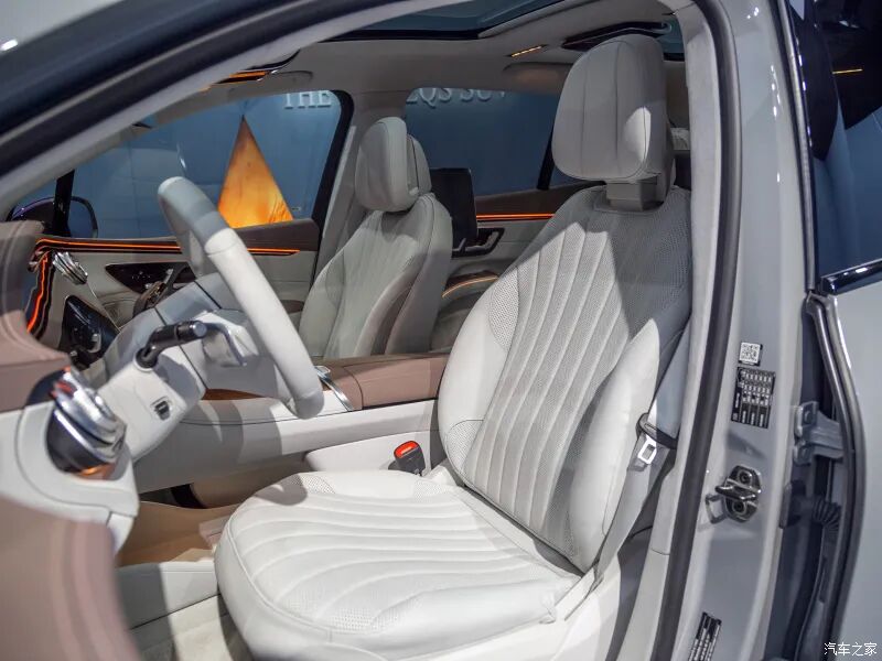 来到车内,与EQS相比仅在细节处有所不同,但初见它还是会被震撼到。OLED整块无缝衔接曲面屏与大面积皮革材质的包覆,将科技与豪华完美诠释,配色方面共提供7套。