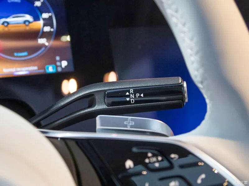 三辐式方向盘没有新意可言,上方按键均为触控式且有反馈,细节到位。后方还配有“换挡拨片”,用于调节动能回收强度。