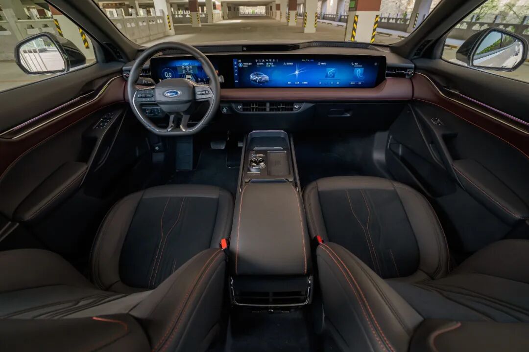 进入到车内,整体的设计以科技简洁为主。这块长度超过1.1米的大联屏相信是最抓人眼球的,这块27寸的4K屏幕显示效果很清晰,并且触摸灵敏度也非常好。