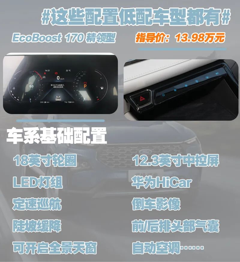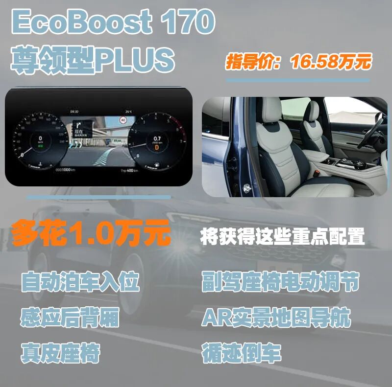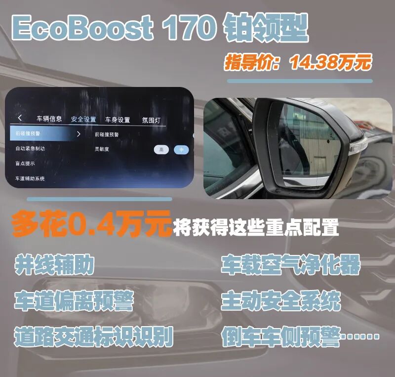 EcoBoost 170 铂领型配置方面表现的确不弱,多花0.4万元可获得的配置也较为丰富,但综合来看表现有些高不成低不就,不太建议各位入手。
