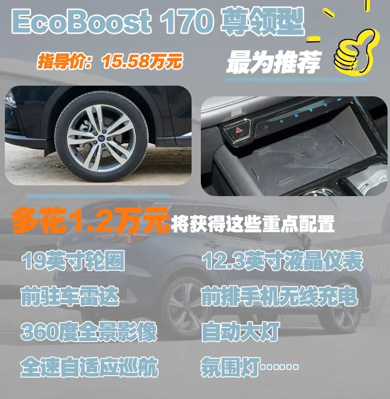 15.58万元、合资身份、中型SUV、近乎满配……这样的表现你不心动?所以,EcoBoost 170 尊领型也是我们最为推荐的车型。