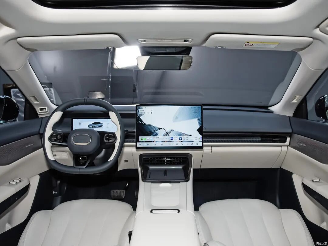 新车内饰整体延续领克08的设计风格,搭载长方形的12.3英寸全液晶仪表盘和15.4英寸中控屏幕,中控屏幕拥有超窄边框设计和2.5K分辨率,搭载LYNK Flyme Auto魅族车机系统。方向盘采用双色设计,中间还有椭圆形的金属装饰,整体造型十分前卫。中控台下部搭载了手机无线充电板,后方的盖板下配备了两个杯架。