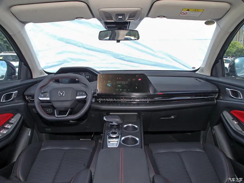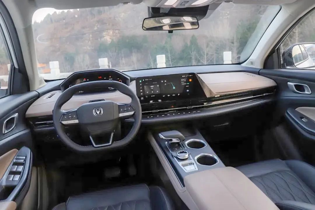 第二代CS55PLUS内饰采用新一代设计语言,环抱样式中控台搭配横向线条,视觉感受更敞亮。液晶仪表和中控大屏造型棱角分明,与不同纹理的饰板共同提升了内饰摩登感和科技气息。多功能方向盘造型扁平小巧,运动感出色。由于采用电子挡杆,所以下方留出了容积可观的储物空间。此外,造型运动的一体式座椅也与整车的时尚年轻定位相契合。