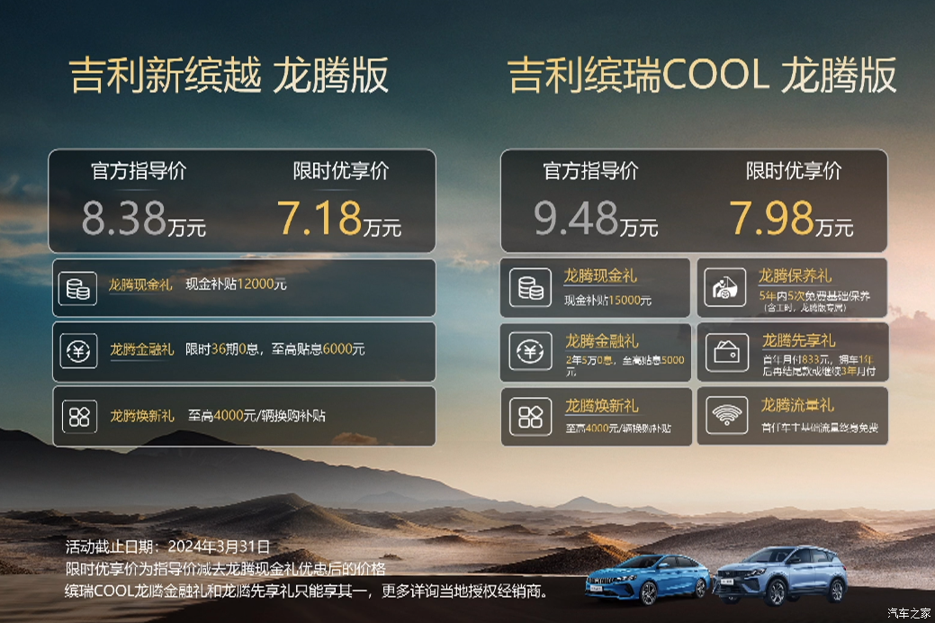 3月8日,我们从官方获悉,吉利汽车旗下缤越/缤瑞COOL龙腾版车型正式上市。吉利缤越龙腾版售价为8.38万元,限时优惠价(3月31日前)7.18万元;吉利缤瑞COOL龙腾版售价为9.48万元,限时优惠价(3月31日前)7.98万元。两款车型在现有车身颜色的基础上新增“苍穹蓝”车身配色。此外,新车还增加了橙色点缀内饰,官方命名为魅影橙。