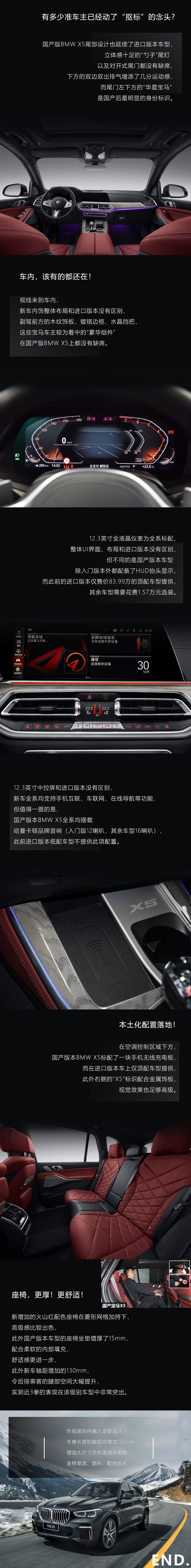 除了外观和内饰等我们看得到的地方国产BMW X5和进口版保持高度一致外,前275、后305(315)mm的胎宽也和进口版本相同。在配置推荐上,我更建议大家入手售价63.50万的2.0T高配车型,相比较入门版车型,该版本车型贵了3万元,配置上增加了选装价格为2万的激光大灯、选装价格1.57万的HUD抬头显示、16扬声器哈曼卡顿音响、全景影像、行车记录仪等配置,由此可见该版本车型性价比优势明显。