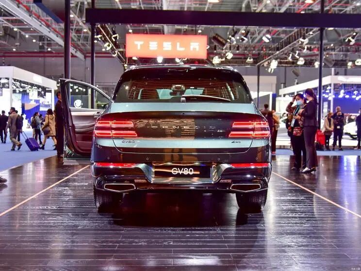 车尾部分,捷尼赛思GV80显得颇具个性的感觉,尾灯呈现出修长的设计风格,加上双边双出排气布局,车尾整体轮廓的曲线非常舒缓,而且细节的处理也很到位。